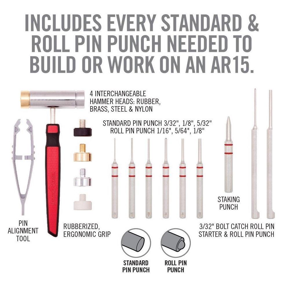 Includes every Standard & Roll Pin Punch needed to build or work on an AR15. This advanced kit includes every standard and roll pin punch needed to build or work on an AR15. A perfectly balanced hammer along with Real Avid's proprietary pin alignment tool makes starting tiny pins easy and accurate. All in a modern stand-up case. A remarkably frustration free experience – even for sausage fingers.