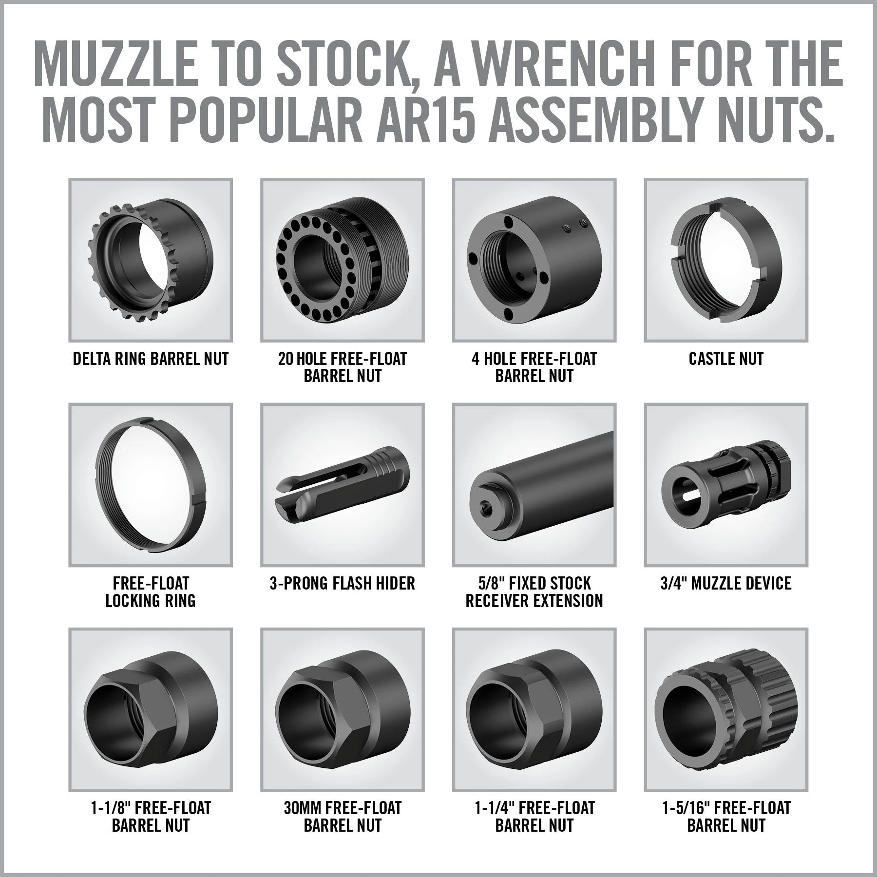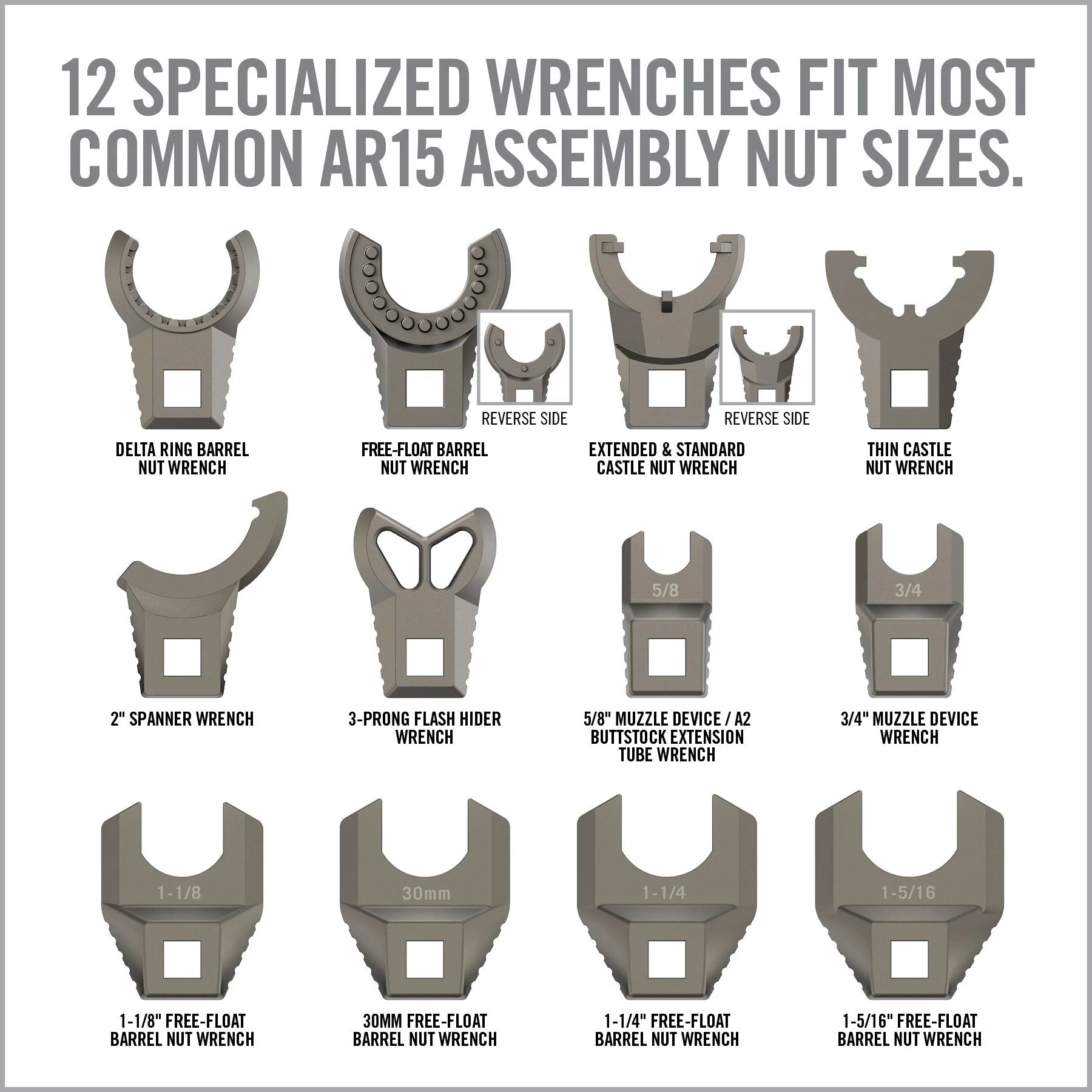 - Master-Fit Wrench Set: 12 specialized crowfoot builder wrenches that fit the most common AR15 assembly nut sizes; titanium coated stainless steel
