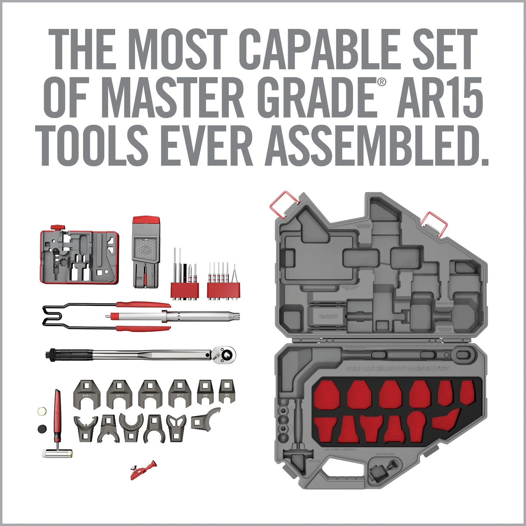 This upgraded kit is the most complete set of Master Grade® AR15 tools ever assembled to build, repair or customize your gun, housed in a convenient professional case. Featuring an extensive set of task-specific crowfoot wrenches for the most common AR15 assembly nuts and a heavy-duty armorer’s torque wrench. Kit includes both upper and lower vise blocks to confidently secure your gun parts for superior control. A comprehensive set of AR15 pin punches and armorer’s hammer pair with the 11-function bench block. To get you started, included is a step-by-step instructional book to guide you through the top 18 modifications made to AR15’s. Upgrade to Master Grade!