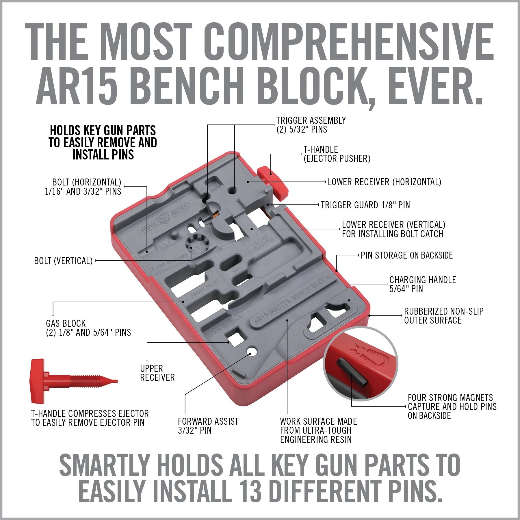 - AR15 Master Bench Block: holds 5 key AR15 components to easily remove or install pins – contoured for bolt, upper receiver, lower receiver, charging handle, trigger assembly features magnetic pin storage