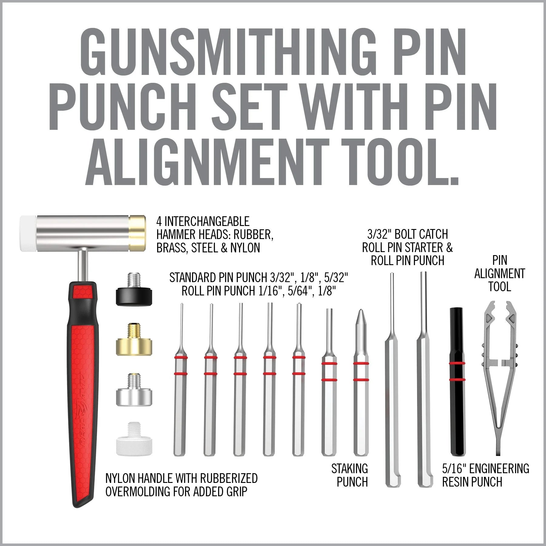 - Accu-Punch Hammer: gunsmithing hammer with 4 interchangeable heads for precise tap control, includes rubber, nylon, brass and steel hammerhead