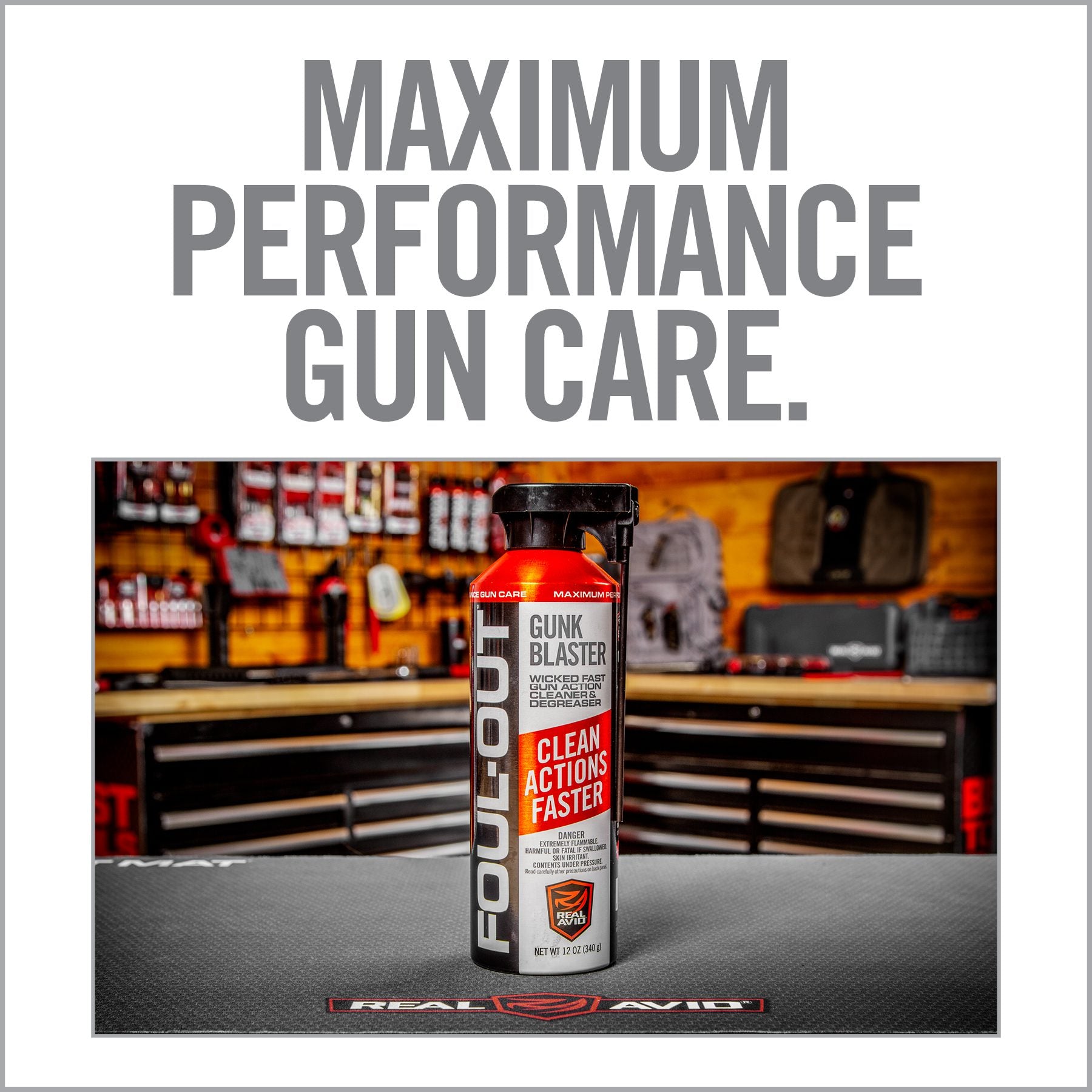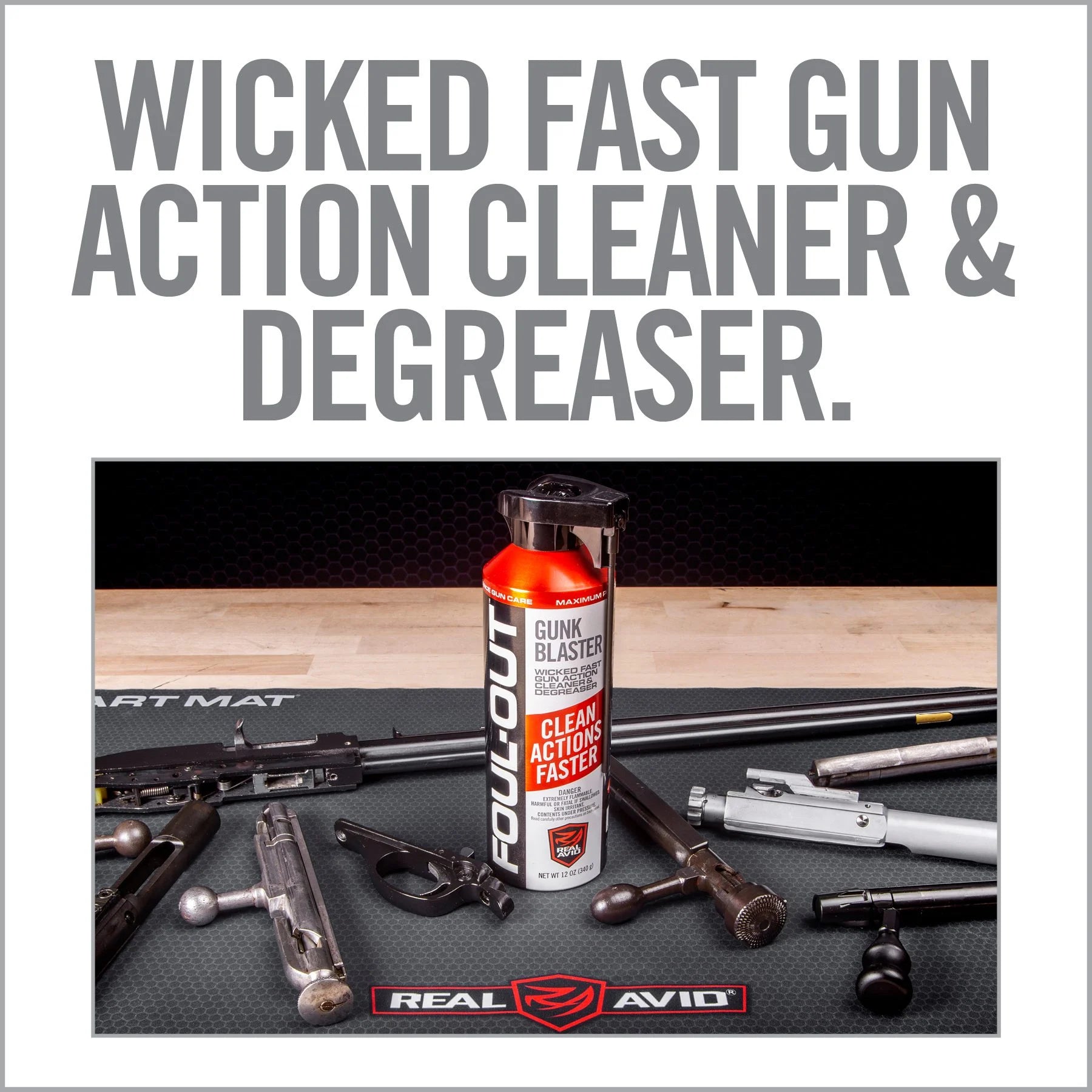 Foul-Out Gunk Blaster blows away grease and grime fast. This powerful gun- metal grade solvent quickly strips gun actions of burnt powder, oil and grease, eliminating malfunctions of moving parts due to fouling and build up. Quickly cleans chambers, actions, trigger groups, bolt groups, slides, choke tube threading, semi-auto gas ports, extractors, ejectors and other hard to reach areas.
