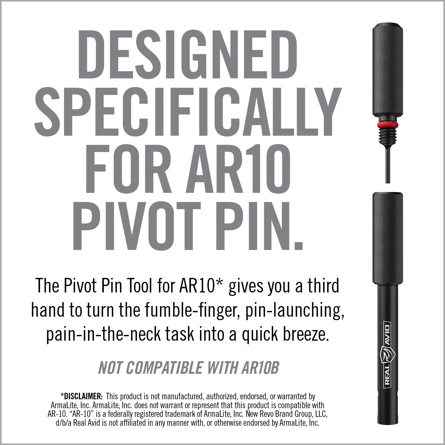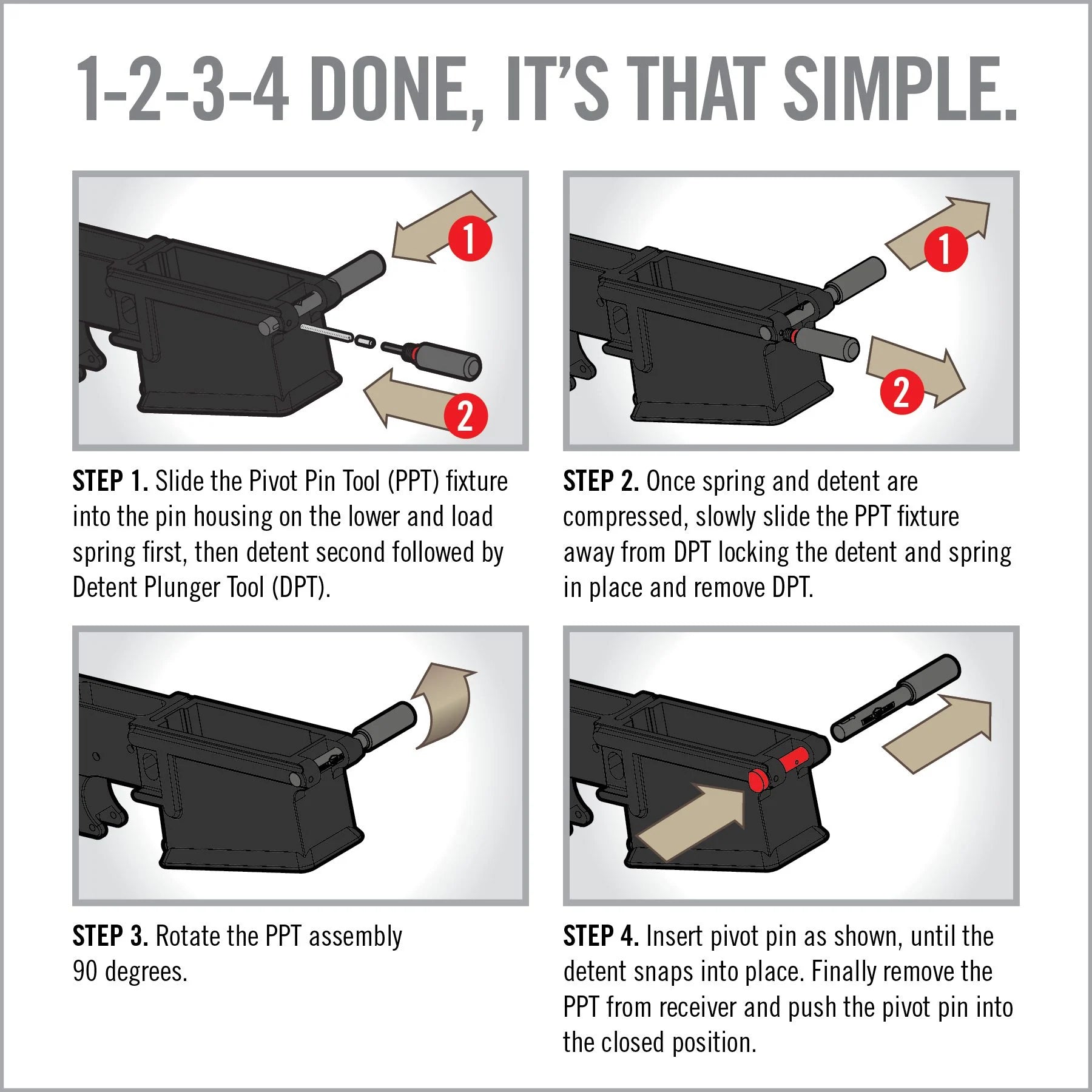 How can such a small task cause such frustration? The Pivot Pin Tool for AR10 gives you a third hand to turn the fumble-finger, pin-launching, pain-in-the-neck task into a quick breeze. 1-2-3-4 done, it’s that simple. Easily install the AR10 Pivot Pin in less than 60 seconds.
