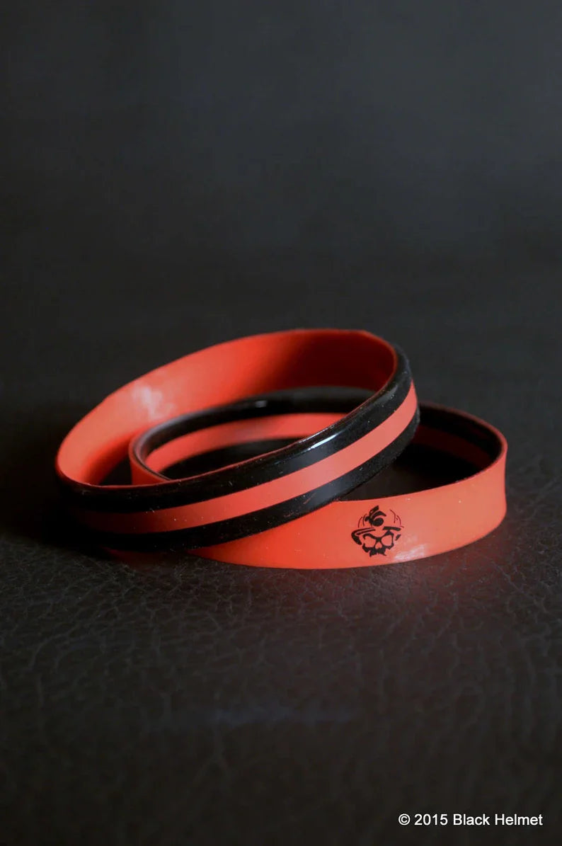 Our silicone wristbands featuring a thin red line on one side and the Black Helmet skull logo on the other.
